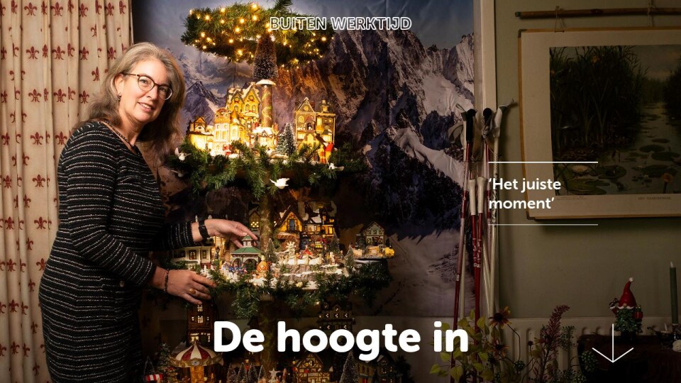 “Het begon met een enkel kersthuisje toen ik net ging samenwonen. Zo’n pittoreske Anton Pieck-achtige waar je een lichtje in kunt doen. Mijn schoonmoeder was er ook dol op, en in de loop der jaren verzamelden we er heel wat. Rond kerst stalde ik ze allemaal uit op een tafel. Toen mijn schoonmoeder ging verhuizen, kreeg ik een deel van die van haar erbij. De tafel werd te klein. ‘Kunnen we niet de hoogte in?’, stelde mijn man voor. Zo ontstond onze zelf-gefabriceerde huisjesboom.