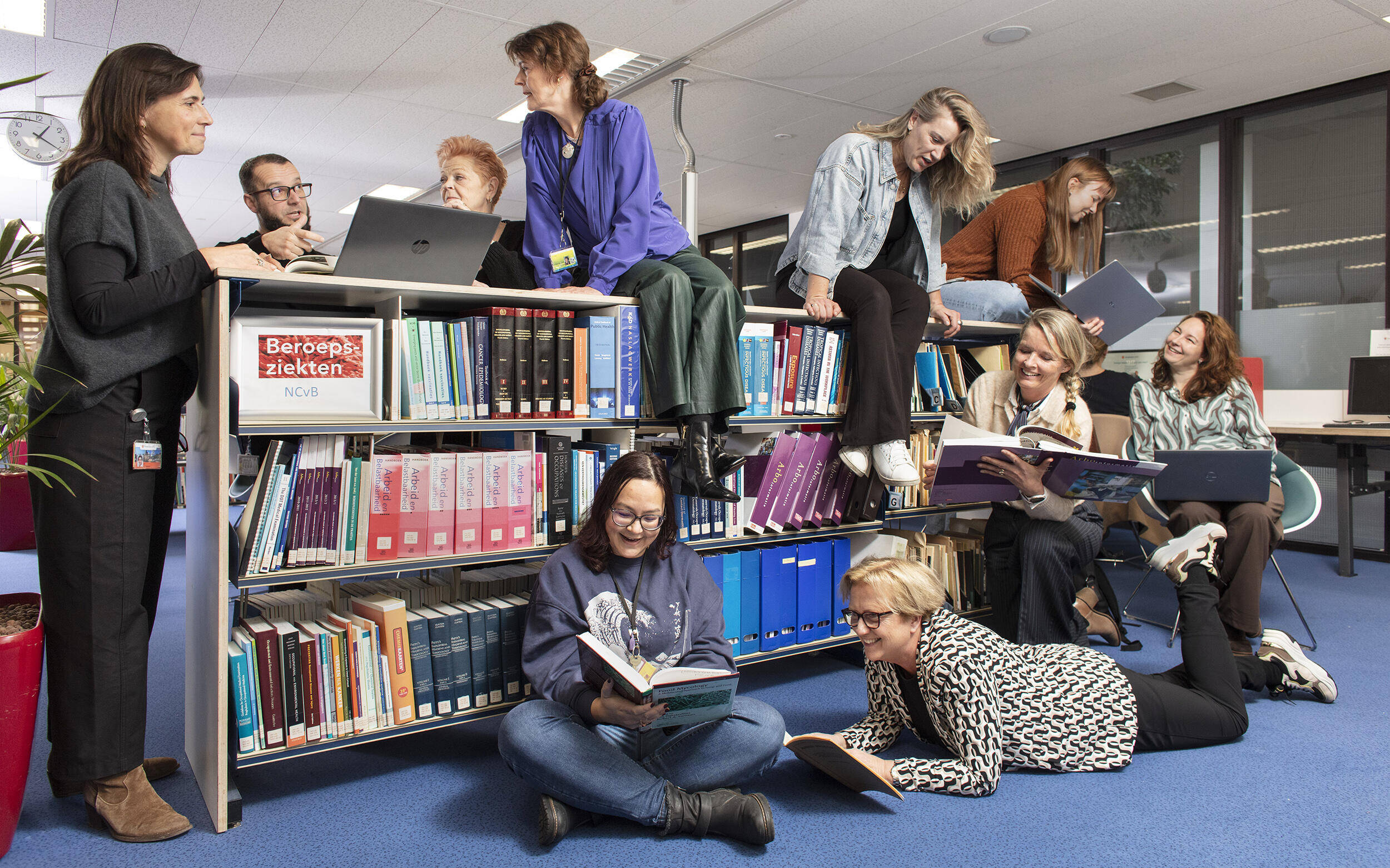 Vlnr staand: Marieke Sprengers, Nedib Hasanovic, Marga Gras. Op de kast: Liesbeth Flippo, Nienke Bleker, Ingeborg Roos. Voorgrond: Kimberley van Genderen, Caroline de Ridder, Sigrid Diemeer, Manon van Hattem